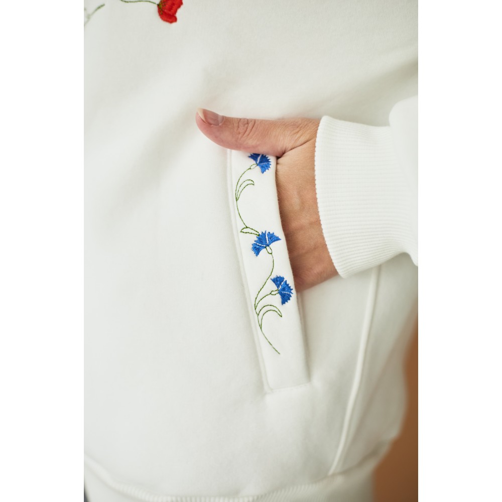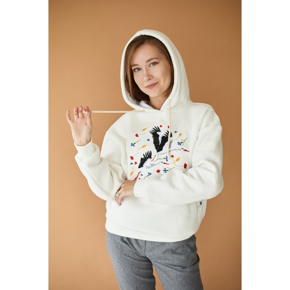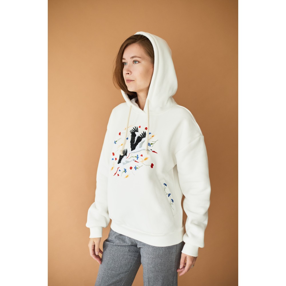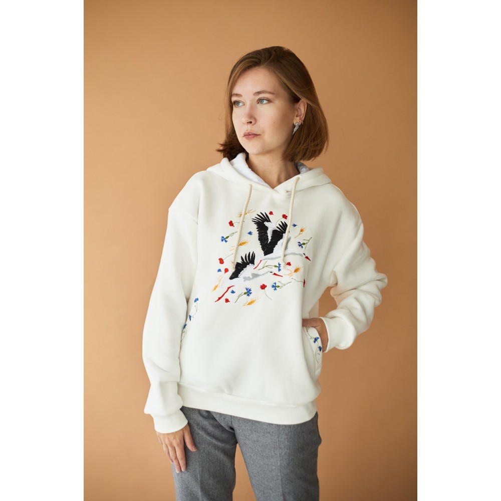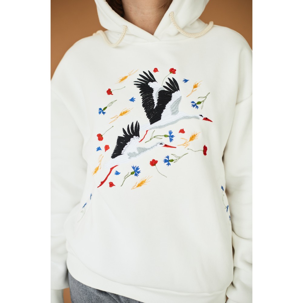 Женская худи с вышивкой "Бусел в композиции цветов " в молочном цвете