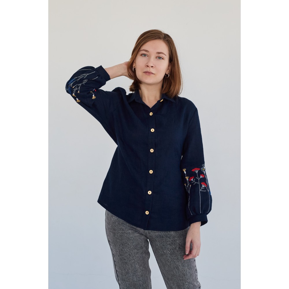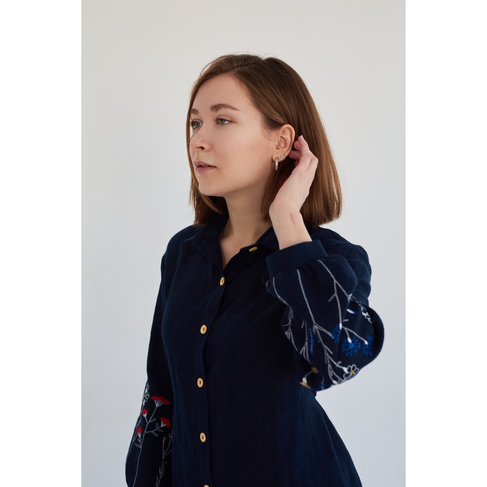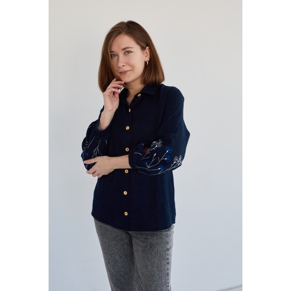 Льняная женская рубашка в темно-синем цвете (манжет фонарик)