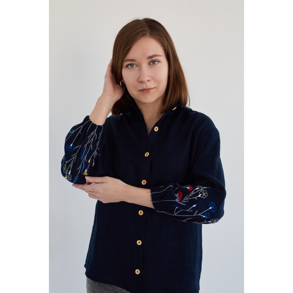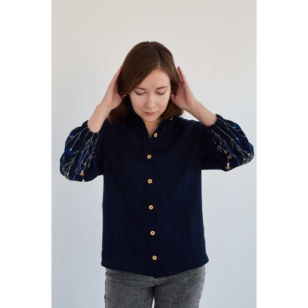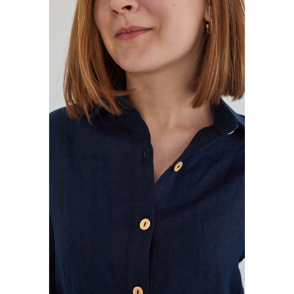 Льняная женская рубашка в темно-синем цвете (манжет резинка)